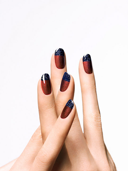 Глубочайшие темные цвета. Воспользуйтесь лаком цвета меди шершавой или бархатистой текстуры в качестве основы, а кончик ногтя накрасьте контрастным оттенком с напылением мелких серебристых блесток.