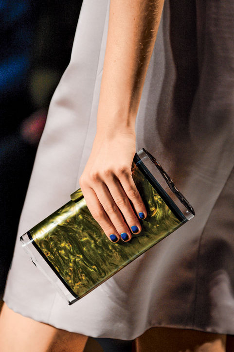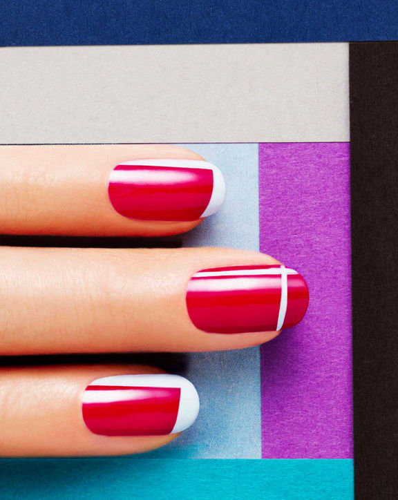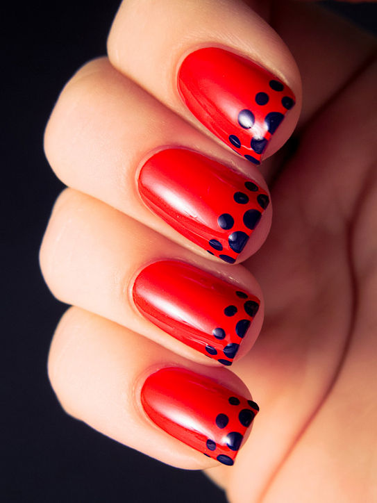 В новом сезоне, как никогда, модно оригинальничать, а эффектность и непредсказуемость - лучшие вдохновители. Попробуйте вместо привычной классики сочетание красного оттенка и синего френча с множеством овальных принтов.