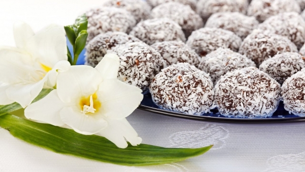 Чернослив ошпарить и пропустить через мясорубку. Орехи обжарить, измельчить. Соединить чернослив с орехами, добавить ванильный сахар, ликер, перемешать. Из полученной массы сформировать шарики и запанировать их в кокосовой стружке. Подавать десерт охлажденным.