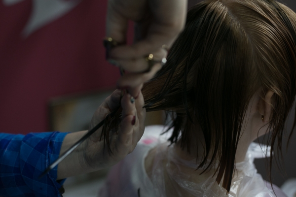 Теперь настало время стрижки. Елена Пискунова уверено корректирует длину, и приняв во внимание то, что у нашей героини довольно тонкие волосы, создает дополнительный объем у макушки.
