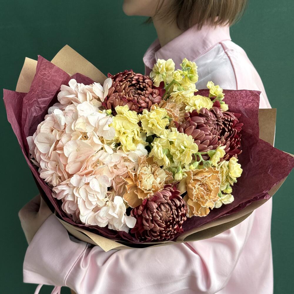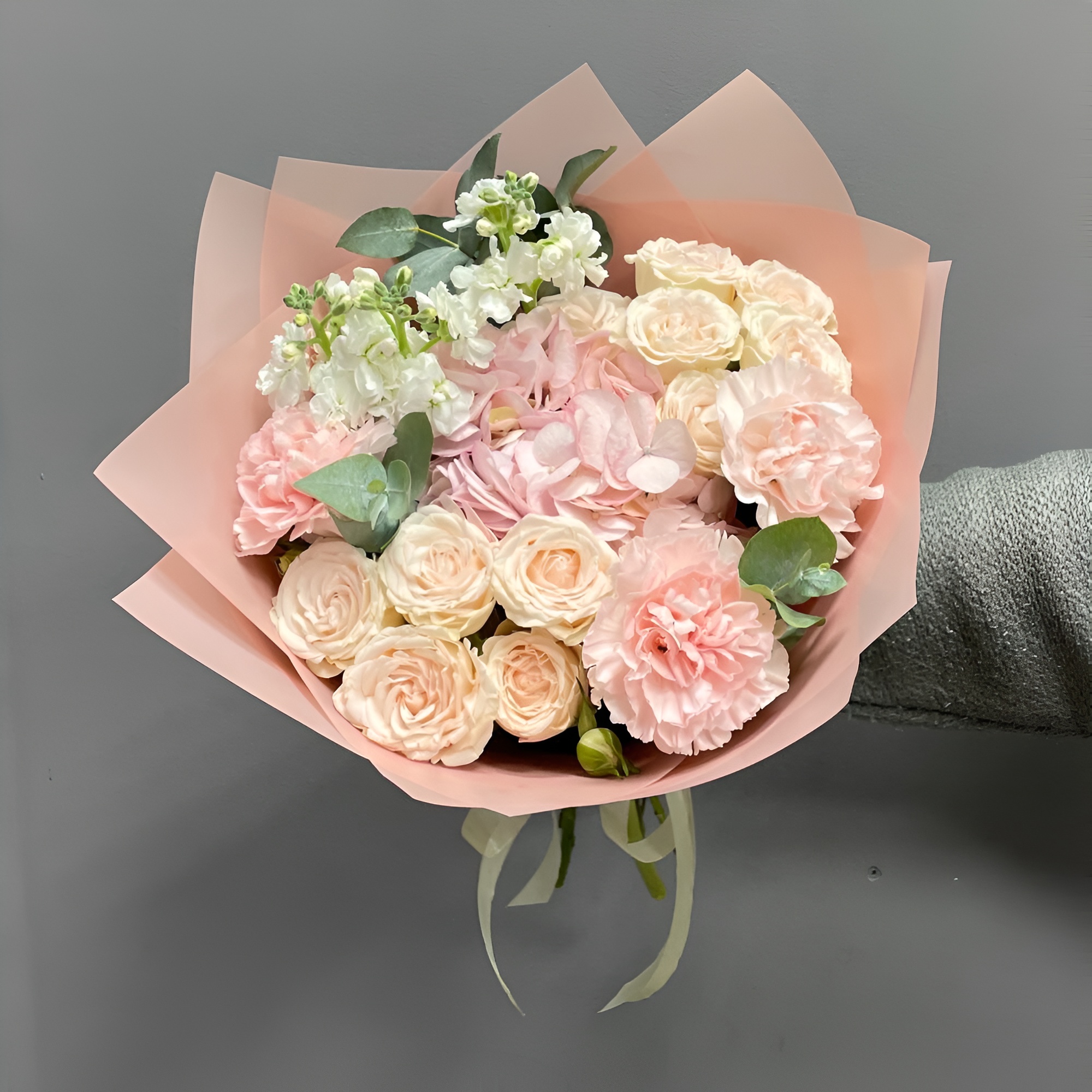Для большинства поводов подойдут цветочные композиции в нежных персиковых, пудрово-розовых или молочных оттенках. Они выглядят нейтрально, но в то же время стильно. В этой цветовой гамме лучше всего сочетаются между собой кустовые розы, пионы, хризантемы, гортензии, диантусы и эустомы. Также в букет можно добавить акцентные веточки зелени, например, эвкалипт или писташ. Они добавят композиции свежести, не перетягивая на себя внимание.