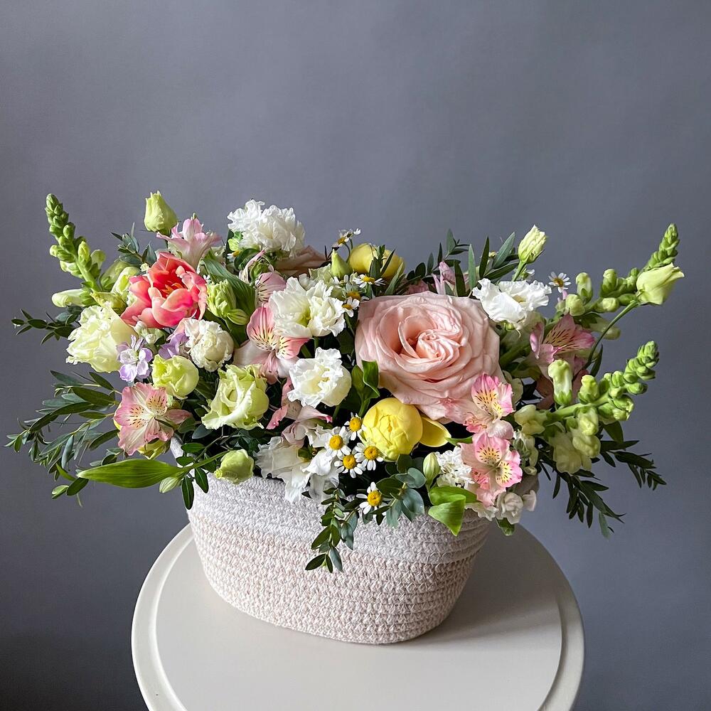 Не только красивым, но и практичным решением будет композиция в джутовой корзине. В будущем она послужит элементом декора нового дома.