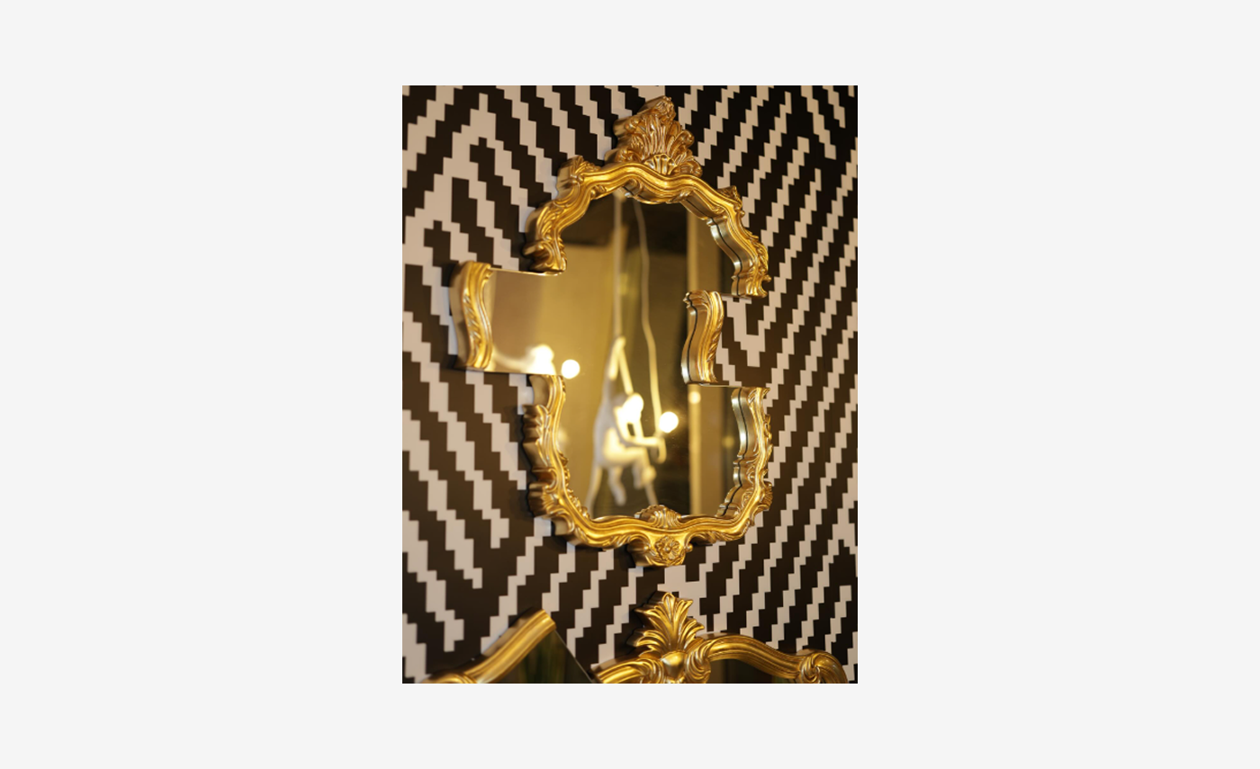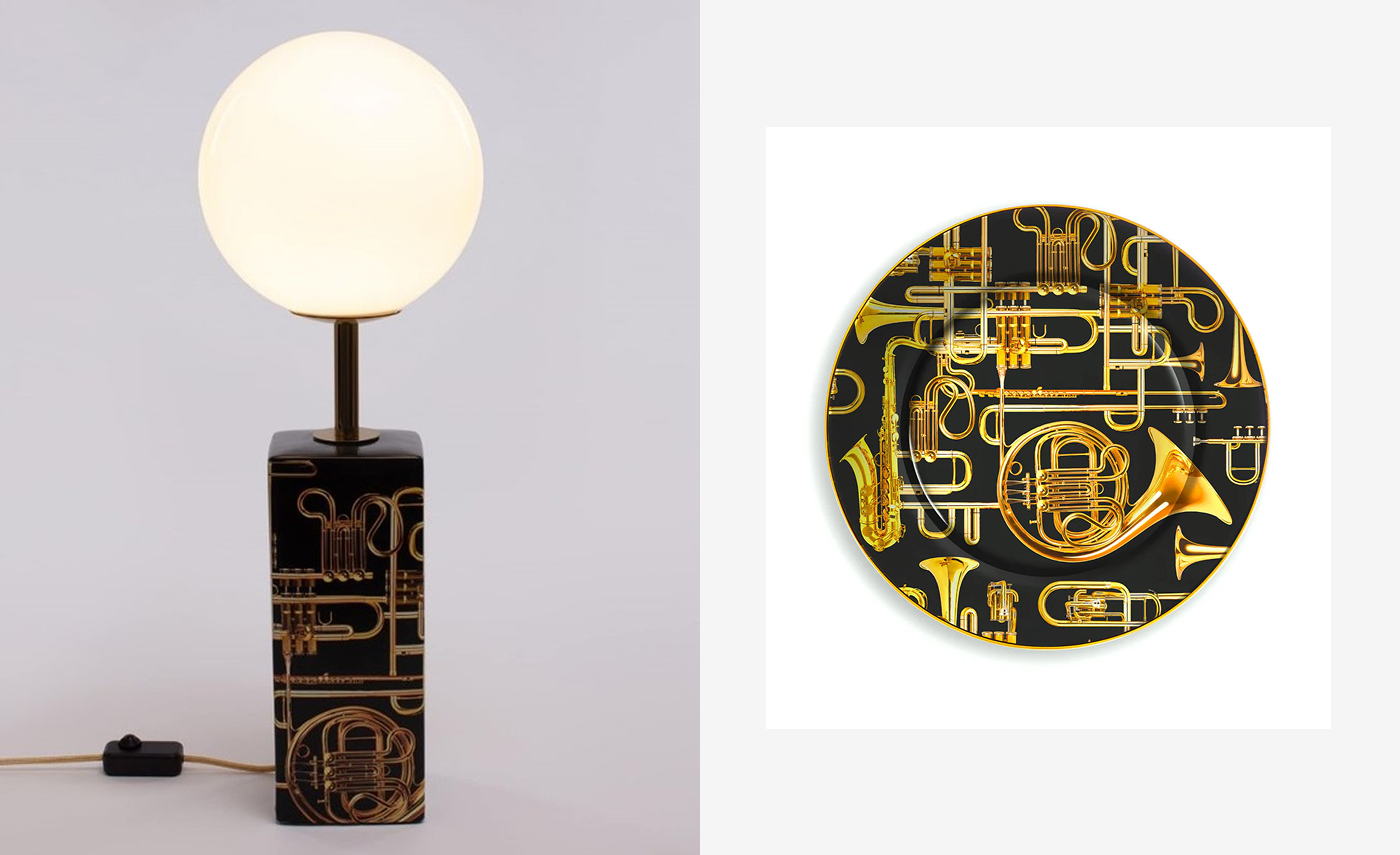 В черно-золотой гамме предметы бренда выглядят особенно выразительно – будь то металлические лампы в форме животных, настенные зеркала с графичными рамами или фарфоровая посуда с позолоченными деталями.